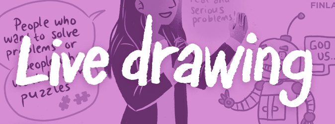 Live drawing is used to document an event with illustrations done on location during the event. These illustrations can make the listener understand the subjects being discussed better through visuals. The drawing process is usually projected on a wall for the attendants to view during the event. I have done live drawings at seminars.